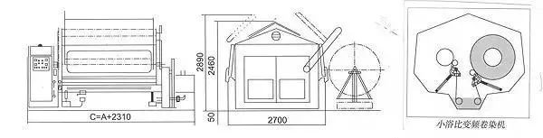 是一種間歇和連續(xù)相結(jié)合的平幅染色機(jī)。主要由浸軋機(jī)和加熱保溫室等組成。浸軋機(jī)由軋車和軋液槽組成。軋車有二輥和三輥兩種,軋輥成上下或左右配置,軋輥間的壓力可以調(diào)節(jié)。織物在軋液槽中浸漬染液后受軋輥軋壓,染液透入織物內(nèi)部,多余染液仍流入軋液槽。織物進(jìn)入保溫室在卷布輥上繞成大卷,于濕熱條件下緩緩轉(zhuǎn)動(dòng)堆置一定時(shí)間,使染料逐漸對(duì)纖維上染。這種設(shè)備適合小批量、多品種的平幅染色?,F(xiàn)在很多工廠在用的冷軋堆染色用的就是這種染色機(jī),如下圖:
